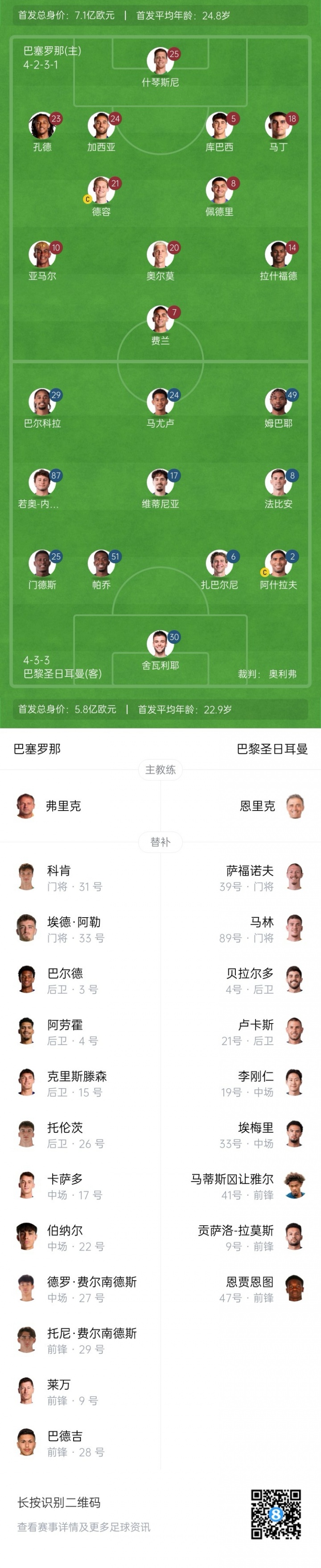 巴萨杆位:25-什琴斯尼、5-库巴西、18-赫拉德·马丁、23-孔德、24-埃里克·加西亚、8-佩德里、20-奥尔莫、21-德容、14-拉什福德、10-亚马尔、7-费兰