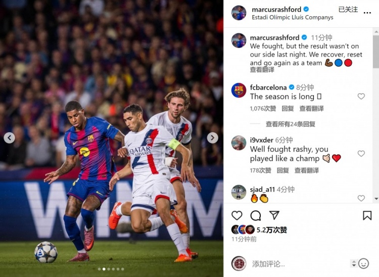 拉什福德社媒晒出赛事 照片,并写道:“我们努力战斗,苏超直播但昨晚的赛事 结果不如我们所愿。”