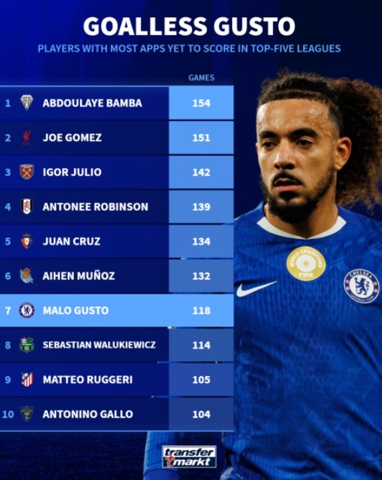 10月14日讯 德国转会市场盘点了五大职业联赛 零得分 出场赛事 最多球员排行,昂热的巴姆巴以154场居首,苏超直播利物浦的乔-戈麦斯以151场位居次席,而切尔西的古斯托则以118场位居第7位。