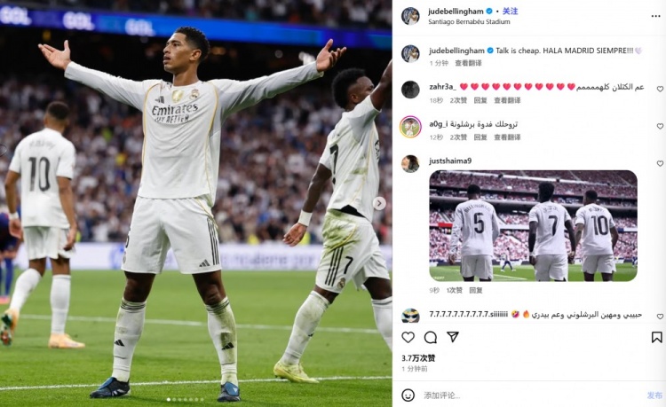 回击亚马尔!贝林厄姆传射建功,社媒晒霸气庆祝照:言语是廉价的