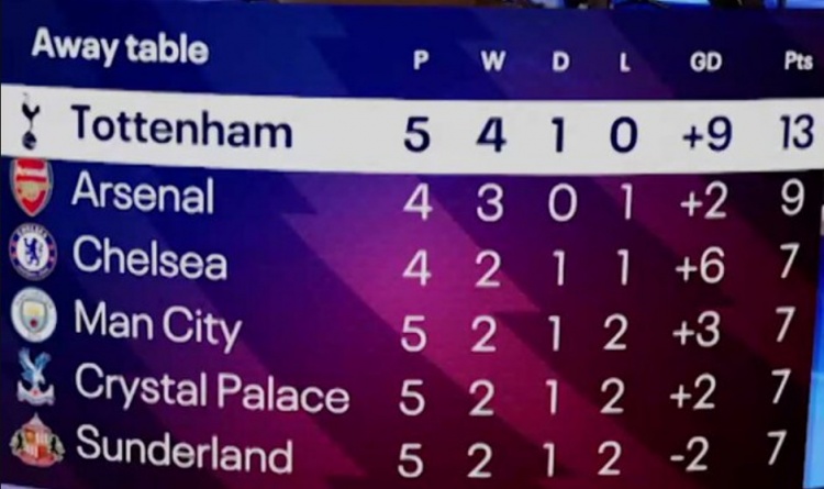 本赛季英超客场应战 积分榜:热刺13分居首,阿森纳9分次席